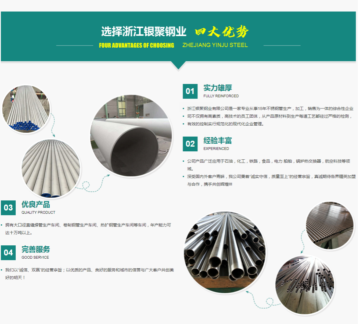 浙江銀聚鋼業(yè)有限公司公司簡介浙江銀聚鋼業(yè)有限公司秉承“質(zhì)量第一、信譽至上”的銷售宗旨和“團結(jié)奮進、拼搏創(chuàng)新”的企業(yè)理念,致力于創(chuàng)造和實現(xiàn)富有活力的企業(yè)管理模式和建設完善質(zhì)量管理體系,堅持以“名牌戰(zhàn)略”為經(jīng)營原則,公司憑借豐富的銷售經(jīng)驗和管理理念,已具有較強的銷售和服務團隊。公司將以積極創(chuàng)新,不斷開拓進取與發(fā)展,提高質(zhì)產(chǎn)質(zhì)量,拓展市場領域,使我們的產(chǎn)品穩(wěn)中...